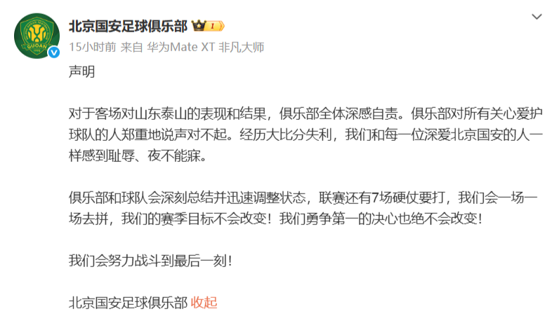 对于客场对山东泰山的表现和结果,俱乐部全体深感自责。俱乐部对所有关心爱护球队的人郑重地说声对不起。经历大比分失利,我们和每一位深爱北京国安的人一样感到耻辱、夜不能寐。俱乐部和球队会深刻总结并迅速调整状态,联赛还有7场硬仗要打,我们会一场一场去拼,我们的赛季目标不会改变!我们勇争第一的决心也绝不会改变!我们会努力战斗到最后一刻!